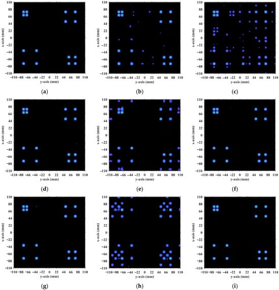 At the critical imaging range L = 8.71 m, a key transition occurs. implies that columns in RSM St corresponding to scatterer pairs with the row and column index differences 0 or 39 exhibit near-unity correlation, as shown in Figure 26. However, the 16 dominant scatterers with σ′ = 1 are constrained to the column and row index range of [7, 39] on the imaging plane, as shown in Figure 3. Given and , columns corresponding to scatterers with σ′ = 1 are never considerably correlated with others. Strong correlations exist only among dummy scatterers with σ′ = 0. This potentially enables dominant scatterer discrimination without interference from other scatterers in the target reconstruction process. Consequently, imaging results obtained via LSM, SBL, and Tikhonov regularization significantly degrade as shown in Figure 27a–c due to the presence of strongly correlated columns in RSM St, while TwIST maintains superior quality as shown in Figure 17i. Thus, the strong correlation between columns of RSM St corresponding to dummy scatterers with σ′ = 0 never impairs TwIST’s performance, whereas that corresponding to dominant scatterers with σ′ = 1 compromises it. The abrupt disappearance of strong correlation between the RSM’s columns corresponding to scatterers with σ′ = 1 renders the imaging quality at L = 8.71 m an extremum in Figure 15. For L > 8.71 m, the columns of RSM St corresponding to the dominant scatterers with σ′ = 1 on the imaging plane are no longer strongly correlated, yielding PSI >1 and consistently low RIE for TwIST, as shown in Figure 15. As a result, for this L > 8.71 m, TwIST outperforms LSM, SBL, and Tikhonov regularization as shown in Figure 28.