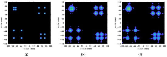 TwIST-reconstructed images: (a) At L = 1.34 m with ; (b) L = 1.5633 m with ; (c) L = 2.2333 m with ; (d) L = 2.5 m with ; (e) L = 4.1317 m with and ; (f) L = 5.0 m with ; (g) L = 5.025 m with ; (h) L = 6.7 m with ; (i) L = 8.71 m with ; (j) L = 10.05 m with ; (k) ; (l) . For L < 1.6 m, near-field effects preserve phase diversity and thus imaging quality (e.g., L = 1.34 m). At intermediate range (1.6 m < L < 5.025 m), quality degrades severely if is an integer (m is an integer, e.g., L = 4.1317 m). For 5.025 m < L < 8.71 m, imaging degradation recurs when is a precise integer (e.g., L = 6.7 m). For 8.71 m ≤ L < 10.05 m, TwIST reconstruction imaging succeeds at any L because strong correlations involve dominant scatterers (σ′ = 1) which are no longer present. For , imaging quality degrades monotonically with L (e.g., L = 17 m, 18 m). High quality is achieved at non-integer (e.g., L = 2.5 m, 5.0 m, 5.025 m, 10.05 m).