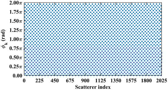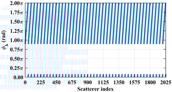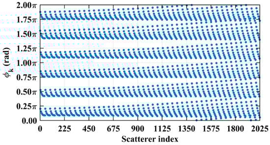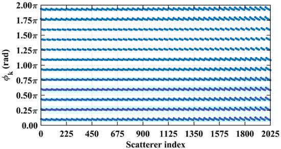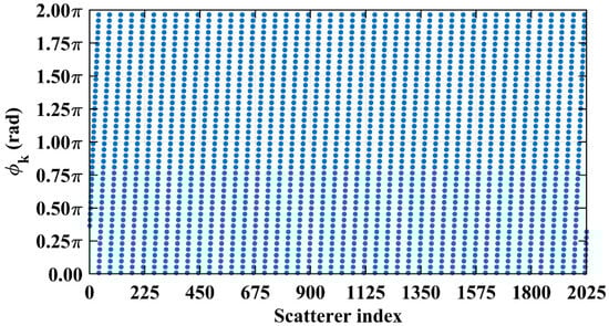 For typical symmetric systems where and as shown in Table 1, being an integer serves as a sufficient criterion to assess column correlation. The preceding analysis indicates that if is precisely an integer, for the k1-th and k2-th scatterers whose column and row index differences are an integer (including 0) multiple of , the phase difference vector per Equation (19) exhibits a narrow concentration within a specific numerical range.