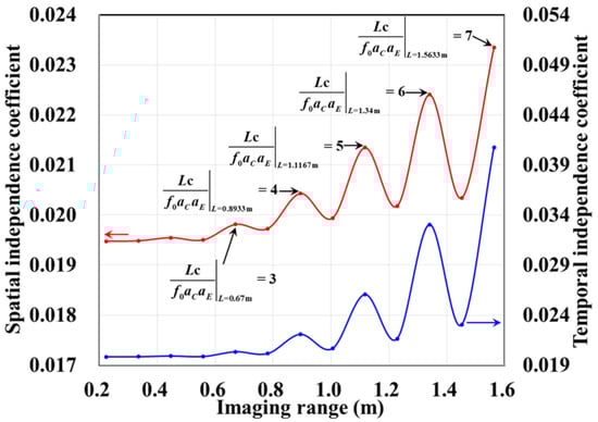 Zoom-in view of imaging range L < 1.6 m from Figure 14. As L increases, attenuation of near-field effects allows to concentrate and to cluster more severely when is a precise integer. This leads to increasingly pronounced extremal points in spatiotemporal independence at integer values of .