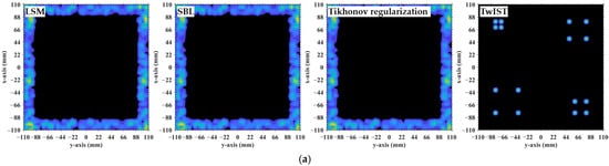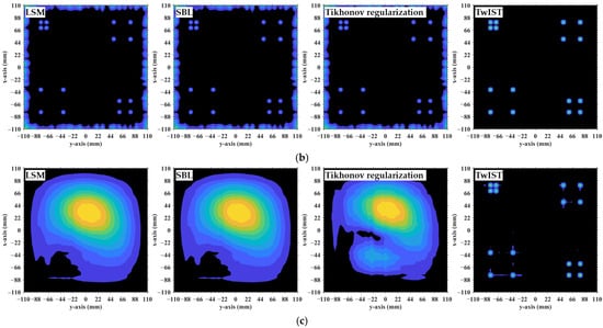 Comparison of imaging results obtained by LSM, SBL, Tikhonov regularization and TwIST: (a) At L = 8.9333 m with ; (b) at L = 9.8267 m with ; and (c) at . Imaging results of LSM, SBL, and Tikhonov regularization are highly consistent with each other, yet all are inferior to those of TwIST. Brighter colors represent larger magnitudes, while darker areas represent values closer to zero.