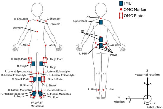 Participants were outfitted with 28 reflective OMC markers on bony landmarks of the lower extremities, trunk, and neck (Figure 1). Nine Noraxon Ultium Motion IMUs were placed on the feet, legs, and trunk in accordance with manufacturer instructions (Noraxon USA, Scottsdale, AZ, USA) (Figure 1).