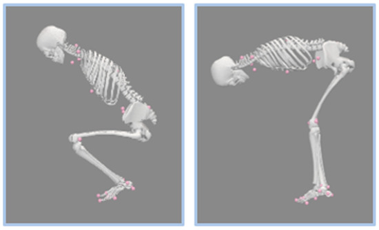 Posture demonstration. The left demonstrates squat posture in the sagittal plane, characterized by high knee flexion and a more upright torso. The right demonstrates stoop posture in the sagittal plane, characterized by low knee flexion and a horizontal torso position. The pink markers represent the OMC system as mentioned above in Figure 1.