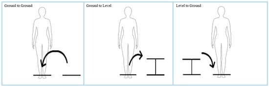 - Level to ground condition: In this condition, weight was lifted from the level height surface (either located from the left or right side) and placed on the ground in front of the participant. The process was repeated on the contralateral side (4 trials total, with 2 trials in each direction).