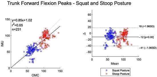 Scatter plot of the IMU and OMC peak angles with line of best fit (left), and Bland–Altman plot (right) of the peak trunk flexion angles for both squat and stoop postures. No outliers were removed in this dataset.