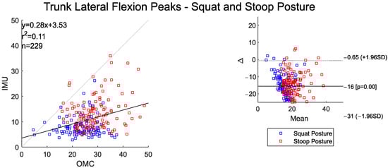 Scatter plot of the IMU and OMC peak angles with line of best fit (left), and Bland–Altman plot (right) of peak trunk lateral flexion angles for both squat and stoop postures. Two outliers were removed.