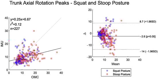 Scatter plot of the IMU and OMC peak angles with line of best fit (left), and Bland–Altman plot (right) of peak trunk axial rotation angles for both squat and stoop postures. Four outliers were removed.