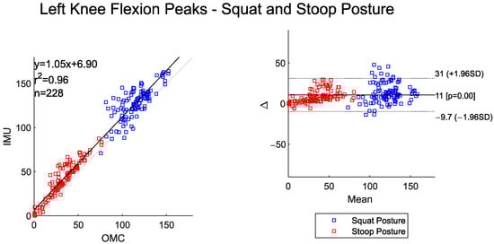 Scatter plot of the IMU and OMC peak angles with line of best fit (left), and Bland–Altman plot (right) of peak left knee flexion angles for both squat and stoop postures. Three outliers were removed.