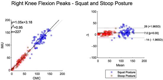 Scatter plot of the IMU and OMC peak angles with line of best fit (left), and Bland–Altman plot (right) of peak right knee flexion angles for both squat and stoop postures. Four outliers were removed.