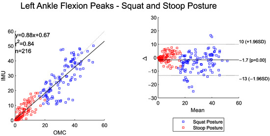 The scatter and BA plots for left and right ankle flexion also illustrate two distinctly separate groups, one for each assessed posture (Figure 9 and Figure 10). The IMU system overall measured slightly lower peak ankle flexion values for the left and right side when compared to the OMC (BA plot bias for left ankle −1.7° and right ankle −3°). The BA plots show proportional bias, with greater system differences at higher peak angles. The left and right peak ankle flexion angles shows a high correlation between the two systems (Figure 9 and Figure 10).