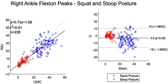 Scatter plot of the IMU and OMC peak angles with line of best fit (left), and Bland–Altman Plot (right) of peak right ankle flexion angles for both squat and stoop postures. Three outliers were removed.
