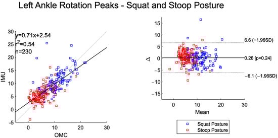 The BA plot shows a small overall system bias for the left- and right-side peak ankle rotation angles (<1°). The scatter plots show moderate-to-high agreement between the peak values (Figure 11 and Figure 12). The IMU system had a tendency to underestimate ankle rotation relative to the OMC at higher joint angle values and overestimate the OMC system at lower ankle rotation angles.
