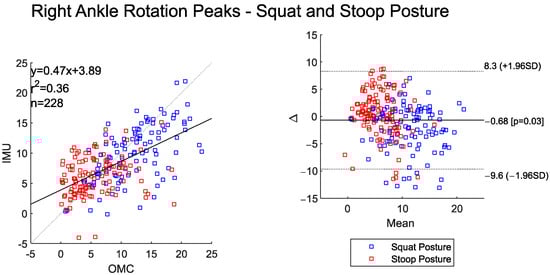 Scatter plot of the IMU and OMC peak angles with line of best fit (left), and Bland–Altman plot (right) of peak right ankle rotation angle for both squat and stoop postures. Three outliers were removed.