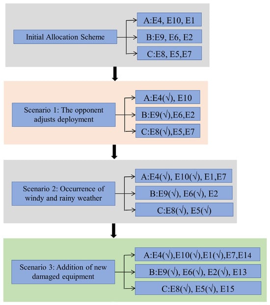 - Maintenance unit A: As an “elastic task unit”, it prioritizes receiving transferred tasks and new tasks with low threats and high matching degrees to ensure meeting the requirements of the overall scheme. In windy and rainy weather, it receives E7 transferred from maintenance unit C, increasing the task load and the maintenance time by 136%; when new damaged equipment is added, it receives E14, extending the task chain and increasing the maintenance time by another 31.6%.