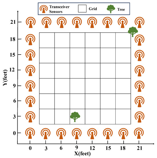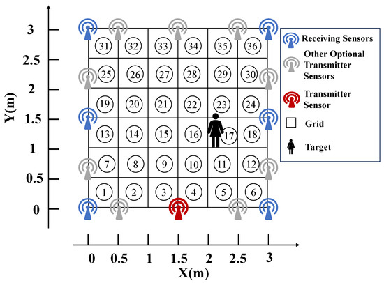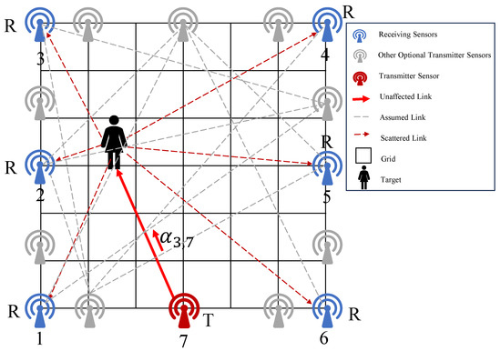 As shown in Figure 2, in a DFL system, the monitoring area can be discretized into a grid of cells. The target in the system will affect the RSS measurement at the anchor point (in a DFL system, wireless sensor nodes are typically referred to as anchor points, and wireless sensors encompass both transmitting and receiving sensors). When the target moves between different grids, the RSS measurement value changes accordingly, thereby forming different joint signal configurations.