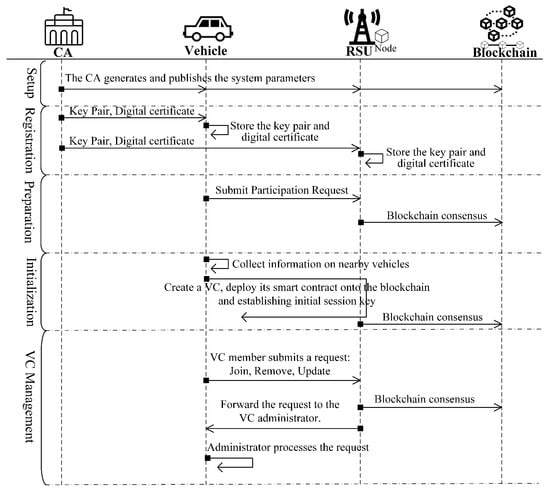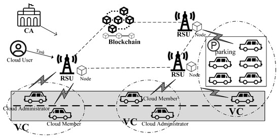 - Vehicles: Each vehicle is equipped with an onboard unit (OBU) that provides computing and communication capabilities and stores certificates and related secrets. A VC is formed by a group of vehicles and supports dynamic membership, allowing vehicles to join or leave the VC as needed. The vehicle that initiates the VC formation may act as the cloud administrator or delegate this responsibility to another vehicle, while the remaining participants serve as cloud members.