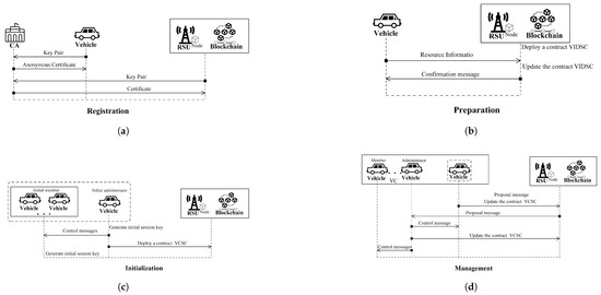 In our scheme, each VC is associated with a dedicated VCSC smart contract, which is deployed and maintained by the cloud administrators on a distributed blockchain shared among RSUs. These contracts store essential VC metadata, including the VC identifier, administrator and member lists, and mapping information, ensuring that this data is consistently replicated and accessible across all RSUs. Consequently, vehicles entering a new area can directly obtain accurate and up-to-date VC information from the local RSU without relying on any centralized discovery platform. This distributed design removes single points of failure and significantly improves the reliability and efficiency of VC information dissemination and discovery. □