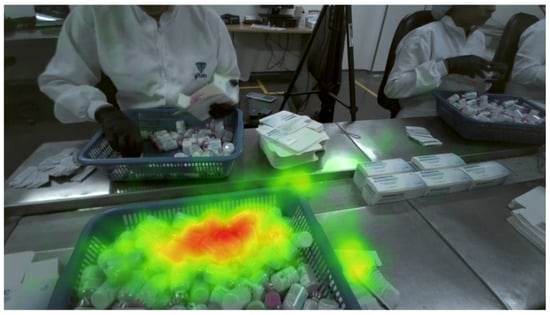 The study was carried out in the packaging area of a pharmaceutical company, where workers routinely perform tasks requiring sustained visual attention, such as checking, packaging, and sealing pharmaceutical products. These tasks involve grouping items into units of one, ten, or one hundred or on large trays and demand continuous visual focus, rapid hand movements, and precise motor control. This environment provided an ideal context for investigating visual fatigue under realistic working conditions. To illustrate the setup, Figure 1 presents a representative heatmap generated from one participant’s eye-tracking data. The visualization shows how visual attention was concentrated on the trays of pharmaceutical products prior to packaging (areas in read), under real shop-floor conditions.