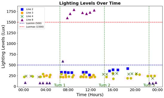 Figure 2 shows the lighting levels recorded across production lines throughout the workday. Each data point represents a measurement taken at the beginning of a trial, with colors and markers distinguishing Line 2 (blue squares), Line 3 (orange circles), Line 4 (green Xs), and Line 8 (purple triangles). The horizontal dashed lines denote the ISO/CIE 8995-1:2025 recommended illumination range for precision tasks: a minimum of 500 lux (blue) and a maximum of 1500 lux (red).
