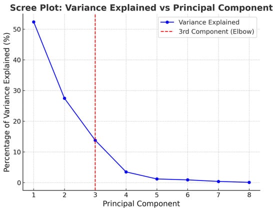 PCA revealed a clear structure in the dataset, identifying three principal components that together explained 93.64% of the total variance. Following the Kaiser criterion, only components with eigenvalues greater than 1 were retained. As shown in the scree plot (Figure 3), the first three components met this criterion, accounting for 52.38%, 27.46%, and 13.79% of the variance, respectively. The scree plot also displayed a distinct “elbow” at the third component, reinforcing this selection by illustrating the diminishing returns in variance explained beyond this point.