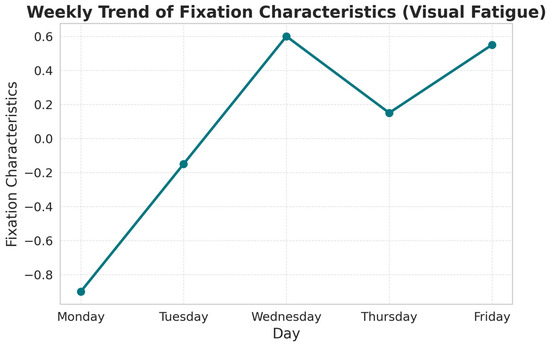 Figure 4 illustrates this trend. At the beginning of the week (Monday), PC2 scores were negative, reflecting shorter and less stable fixations characteristic of a relatively rested visual state. As the week progressed, PC2 values steadily increased and shifted into positive territory, indicating longer and more stable fixations—consistent with the established physiological and behavioral signatures of accumulated visual fatigue.