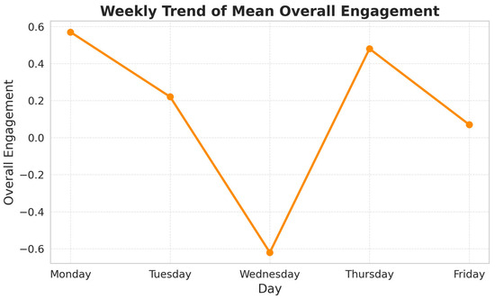 Weekly trend of mean Overall Visual Engagement (PC1). Engagement is highest at the beginning of the week, drops markedly by midweek (Wednesday), shows partial recovery thereafter, and tapers off again by Friday.