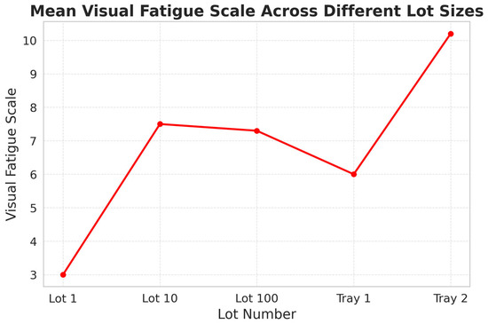 This type of fatigue presents a significant challenge in occupations that require sustained visual precision and attention to detail. It slows performance, increases the likelihood of missing critical signals, and elevates the risk of errors. Such challenges are particularly problematic in sectors such as healthcare, manufacturing, packaging, and transportation. For example, a quality control operator scanning hundreds of products or a technician inspecting small defects under bright lighting may experience reduced accuracy when visual fatigue sets in []. Despite its consequences, visual fatigue is often underestimated or accepted as inevitable. However, its cumulative effects can lead to chronic stress, long-term eye discomfort, and early manifestations of computer vision syndrome (CVS) [,]. This not only compromises worker comfort but also reduces performance and jeopardizes health—an issue that industries can no longer afford to ignore.