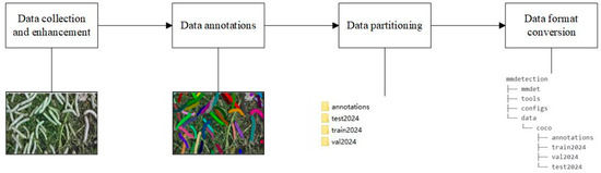 The dataset construction process is illustrated in Figure 1. First, the silkworm images were collected and augmented. Subsequently, instance-level mask annotations were performed. Following this, the dataset was partitioned into training, testing, and validation subsets. Finally, the dataset was converted into the standard COCO dataset format compatible with MMDetection. The detailed construction process will be elaborated on in the subsequent sections.