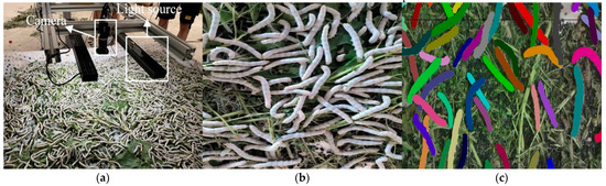 Data acquisition: (a) Hardware; (b) Silkworm image; (c) Annotated image.