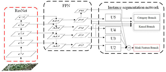As illustrated in Figure 3, the SOLOv2 architecture comprises three main components: a ResNet backbone network, a Feature Pyramid Network (FPN), and an instance segmentation network [14]. The ResNet backbone is primarily responsible for extracting image features. The FPN enhances the model’s capability to detect objects at different scales. The instance segmentation network, serving as the core component of SOLOv2, performs segmentation of individual object instances in images through three parallel processing branches: the category prediction branch (Category Branch), the convolutional kernel prediction branch (Kernel Branch), and the mask feature branch (Mask Feature Branch). SOLOv2 adopts a simple yet effective single-stage instance segmentation framework that achieves high segmentation accuracy. By simultaneously predicting semantic categories and mask categories, it enables both distinction between different objects and identification of similar objects across various regions in an image. Our improvements focus on optimizing the ResNet backbone and enhancing the mask feature branch (highlighted in red in Figure 3).