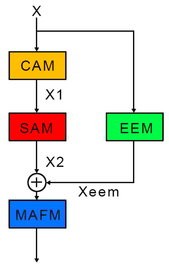To address the challenges of geometric discontinuity and weak edge segmentation caused by overlapping and occluded silkworms, an EAMF-Net was proposed. The EAMF-Net innovatively integrates four components: a Channel Attention Module (CAM), a Spatial Attention Module (SAM), an Edge Enhancement Module (EEM), and a Multi-attention Fusion Module (MAFM). As illustrated in Figure 4, the CAM and SAM are connected sequentially, while the EEM is incorporated in parallel through a bypass connection. Finally, the feature maps are summed and fed into the MAFM to generate the refined output.