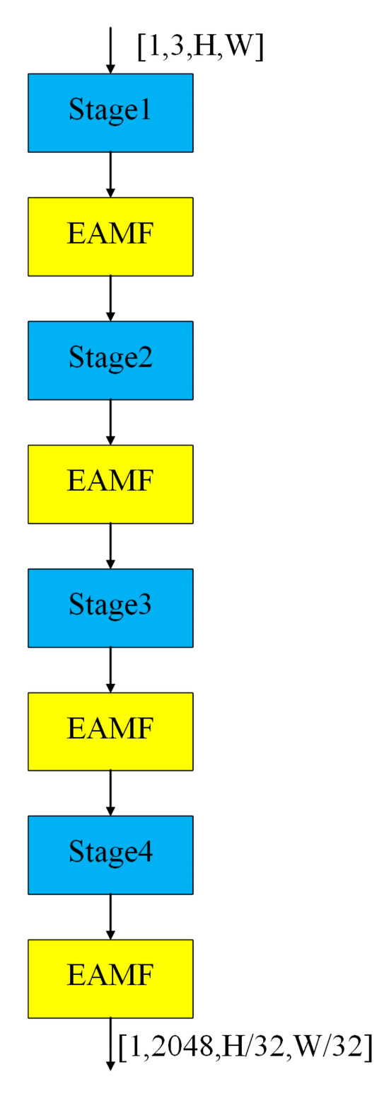 The EAMF-Net is integrated into the backbone network, with the specific connectivity mechanism between residual blocks of adjacent stages illustrated in Figure 7.