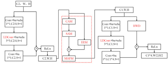 MAFM: As illustrated in Figure 5b, the summed features of and are used as the input to the MAFM, with the computational process defined in Equations (4) and (5). Within the MAFM, three parallel wavelet-based convolutional layers with varying kernel sizes are employed to fuse multi-scale features extracted from preceding modules