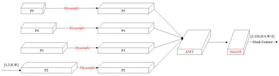 The core functionality of the SOLOv2 mask feature branch lies in constructing foundational features for instance segmentation through multi-scale feature fusion. As depicted in Figure 7, this module processes four-level feature maps from the Feature Pyramid Network (FPN). Initially, hierarchical features are unified to 1/4 of the input image resolution via convolutional operations and bilinear upsampling to achieve spatial dimension standardization. Subsequently, multi-scale information is integrated through progressive summation of feature maps, yielding a composite feature tensor for mask prediction. To enhance silkworm segmentation quality, this study augments the original SOLOv2 mask feature branch by incorporating three novel components: (1) the DySample network that replaces fixed bilinear interpolation with learnable upsampling for adaptive spatial detail recovery; (2) the ASFF network that optimizes cross-scale feature integration using channel-wise and spatial attention mechanisms; and (3) the SimAM, which strengthens feature discriminability without computational overhead. This refined architecture preserves the primary morphological integrity of silkworm targets while effectively capturing fine-grained edge and texture details, thereby improving segmentation accuracy for partially visible specimens and multi-scale objects in complex imaging scenarios.
