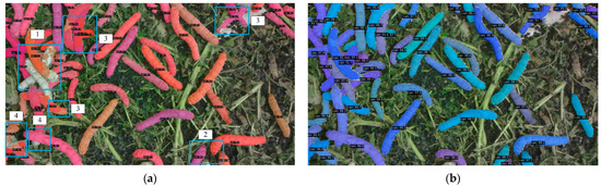 Figure 9 presents a comparative case of the segmentation results between the SOLOv2 algorithm and the proposed method for silkworm instance segmentation. In Figure 9a, the blue rectangular boxes highlight various failure cases of the original SOLOv2 algorithm, including missed segmentation in overlapping silkworm regions (Region 1), missed segmentation of partially visible silkworms (Region 2), over-segmentation (Region 3), and inaccurate boundary segmentation where the predicted edges deviate from the true boundaries (Region 4). In Figure 9b, the method proposed in this paper addresses all the aforementioned issues. Figure 10 provides zoomed-in comparisons for these four cases.