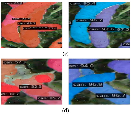 Figure 11 presents additional segmentation examples. Due to space limitations, only the full-image segmentation results are displayed here, without zoomed-in comparative analysis. However, it is evident that the segmentation inaccuracies present in Figure 11a,c are effectively resolved in Figure 11b,d.