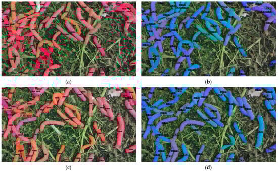 In Figure 10a, comparing the left (SOLOv2) and right (proposed method) results reveals that the original SOLOv2 algorithm fails to segment overlapping silkworms, whereas our approach achieves accurate segmentation. Figure 10b shows a silkworm (bottom-left) with only minimal head visibility. While SOLOv2 fails to segment it, our method successfully detects and segments the silkworm. In Figure 10c, two overlapping silkworms are displayed, with their segmentation masks represented by different colors. The SOLOv2 result incorrectly assigns multiple colors to each silkworm (indicating over-segmentation), while our method generates a single, consistent mask for each silkworm. Finally, Figure 10d demonstrates that SOLOv2 produces a significant boundary misalignment at overlapping regions (left), whereas our method achieves highly precise boundary adherence (right).