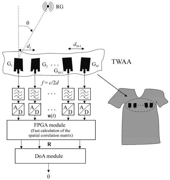 The primary function of the TWAA DoA subsystem is to estimate, at any given time, the angular position of the RG in the azimuthal plane (θ) and the TWAA wearer’s current spatial position during motion. The architecture of the smart TWAA DoA subsystem is shown in Figure 1. It comprises a TWAA with M elements integrated into the wearer’s upper body clothing, narrow-band filters, analog-to-digital (A/D) converters, a field-programmable gate array (FPGA) module, and a DoA module [24].