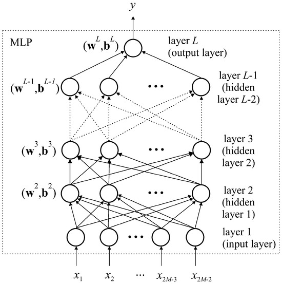 The set of adjustable parameters of an MLP neural network, W, comprises the weight matrices w2, w3, …, wL, and the bias vectors b2, b3, …, bL. During the network training, these parameters are iteratively updated to ensure that the network achieves the mapping described by Equation (10) with the required precision.