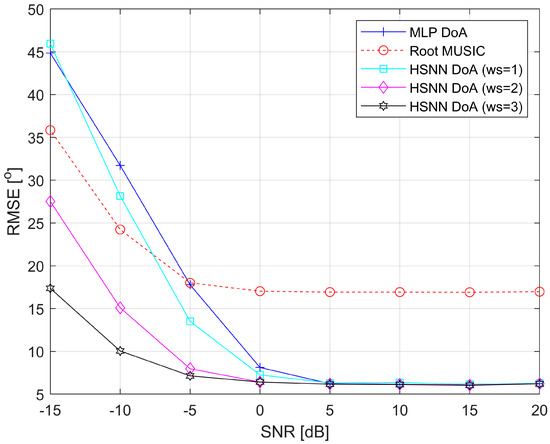 RMSE versus SNR obtained by using MLP-DoA module, HSNN-DoA module, and Root-MUSIC DoA module.