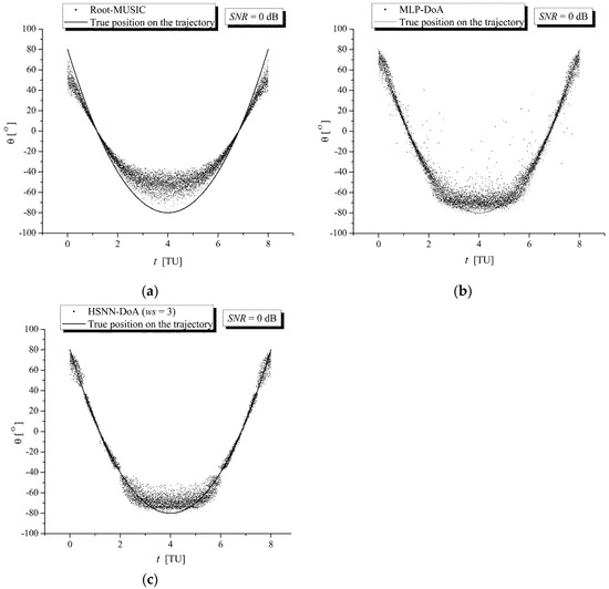 To compare the accuracy and speed of DoA estimation with the MLP-DoA module, the HSNN-DoA module, and the Root-MUSIC DoA module, a simulation of the movement of the TWAA wearer along a selected reference trajectory was performed. During this motion, the angular position of the RG relative to the TWAA, θ, was determined with each of the DoA modules at 8001 time-equidistant points along the trajectory. The simulation of the motion and the estimation of the angle θ with the DoA modules was performed for different SNR values along the reference trajectory, namely for SNR ∈ [20 dB, 15 dB, 10 dB, 5 dB, 0 dB, −5 dB, −10 dB, −15 dB]. The selected reference trajectory is described by the following formula: θ = 10·(t − 4)2 − 80, t ∈ [0, 8], where t is the time expressed in time units (TU). When selecting the HSNN-DoA module, three different cases were considered regarding the time integration window length: ws = 1, ws = 2 and ws = 3.