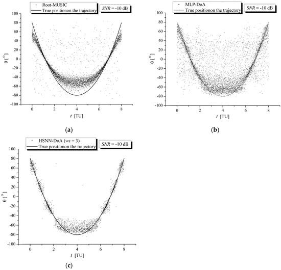 Figure 5 and Figure 6 show a comparison of the DoA estimation results for RG signals along the trajectory of the TWAA wearer obtained with (a) the Root-MUSIC module, (b) the MLP-DoA module, and (c) the HSNN-DoA (ws = 3) module under increased noise conditions (SNR = 0 dB) and significantly increased noise conditions (SNR = −10 dB), respectively. These figures show that during the movement of the wearer along the reference trajectory, the values of the angle θ estimated with the HSNN-DoA (ws = 3) module are significantly closer to the true values than the values estimated with the Root-MUSIC and MLP-DoA modules.