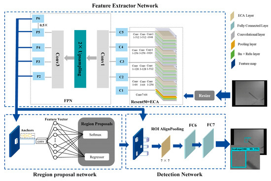 To solve these problems, a multiscale feature network structure for leakage gas feature extraction and enhancement was developed, as in the feature extraction network shown in Figure 2. First, feature extraction is achieved by furnishing ResNet50 with the ECA mechanism to suppress useless information; then, the FPN is utilized to fuse the semantic information. Next, the FPN is used to fuse the semantic information from different layers of ResNet50+ECA to obtain the final gas features.