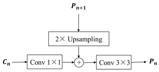 The RPN input is the last layer of the feature map of the feature extraction network in the conventional Faster R-CNN with single feature information. The multiscale fusion approach of the FPN [35] was proposed in 2017 and proved to be accurate and fast in target detection. In the feature extraction stage, the multiscale pyramid provides a general structure to produce enhanced feature representations. With the feature pyramid networks, feature maps at each scale have strong semantic information, and the amount of calculation is greatly reduced [36]. The FPN structure consists of three main parts: bottom-up, top-down, and lateral connections. First, the bottom-up is the feature extraction process of the ResNet50+ECA network, which categorizes the feature map into five levels, from C1 to C5. Second, the top-down process upsamples the feature maps obtained at a high level and then passes them downward, passing the high-level features, which contain rich semantic information, to the low-level features. As shown in Figure 3, the lateral connection consists of three main steps: (1) The feature maps of C2–C5 reduce the dimensionality by a 1 × 1 convolution to increase the nonlinearity of the image. (2) The acquired feature Cn is fused with the upsampled acquired feature Pn+1. (3) To eliminate the aliasing effect caused by upsampling, a 3 × 3 convolution operation was used to output the feature maps P2–P5, where P6 was obtained by downsampling P5. To improve the detection speed, the high-resolution C1 feature maps were not fed into the FPN. Therefore, the feature input of the RPN was changed from single to multiscale (P2–P6), which can effectively fuse the deep and shallow gas information and improve the accuracy of gas leak detection.