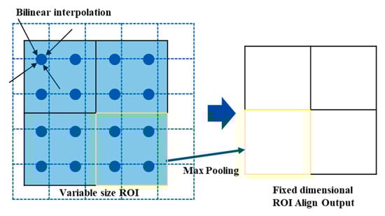 RoI Align Pooling [37] effectively solves the problem of mapping error and mean error caused by RoI pooling and improves the recognition accuracy of the model. As shown in Figure 4, the RoI alignment uses bilinear interpolation to calculate the exact value of multiple sampling points, and max pooling to calculate the maximum value of multiple sampling points as the final value. This replaces the quantization operation of the RoI and preserves the number of floating points. For gas leak detection tasks that require precise boundary box localization, its spatial alignment mechanism can significantly enhance localization accuracy. Therefore, RoI Align was used in this study to achieve more accurate detection and identification results.