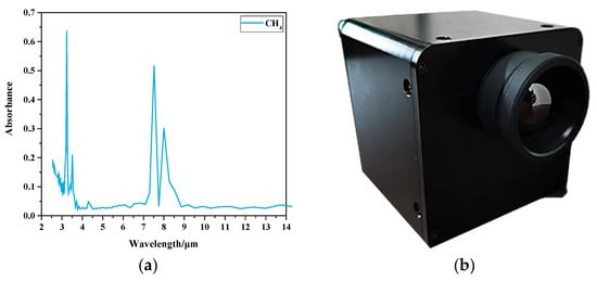 Uncooled infrared imaging gas leak detection system. (a) CH4 infrared absorption spectrum. (b) Uncooled infrared imaging camera for gas leak detection.