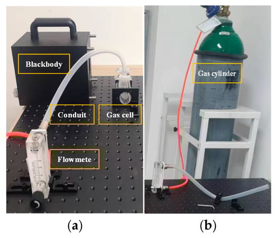 The experimental setup is illustrated in Figure 6 [39] and comprises a CH4 gas cylinder with a capacity of 40 L (room temperature, concentration: 1000 ppm), black body, gas cell, flowmeter, number of conduits, and fixed fittings. Image acquisition was realized using the uncooled, infrared imaging gas leak detection system described in Section 2, and the images were saved in JPG format. The software environment was Visual Studio 2015 + OpenCV 3.2.0, and the operating system was Windows 10. For this experiment, a black body and a wall were used as the background. The indoor temperature is 26 °C, and the relative humidity is 40–50%. Two leakage sources were simulated using a conduit and a gas cell, and the leakage volume was controlled with a flow meter to simulate the leakage scenarios. Scenario 1 involved a conduit source leakage with a wall in the background. Scenario 2 involved a gas cell source leak with a black body background. The experiments were performed at leak rates of 300, 100, and 30 mL/min, with a distance of 0.8 m between the system and the leak source. Each case was recorded at a frame rate of 20 fps for 4 min (repeated five times). The leaked gas may have been unstable at the beginning and end of the process. Therefore, the first 30 s and last 30 s of each video were cut out of the experiment.