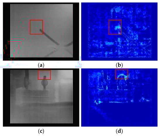 The infrared images of the gas leakage in different scenarios of this experiment are shown in Figure 7, where the boxed parts indicate the gas leakage source and some leakage areas. The specificity of the gas target results in a low contrast in the gas infrared image, making accurate localization of the leakage source difficult under the experimental conditions. The detection of gas leaks has been realized using gas motion characteristics. However, this requires many preprocessing steps and is not able to perform large-scale detection in complex situations in a timely manner. Figure 7c,d show the pseudo-color images obtained using the motion detection method [38]. The conventional method of relying on professionals to detect the leakage source poses a major challenge in ensuring efficiency and accuracy at the same time. Therefore, a gas leak detection method is proposed based on infrared images and Gas R-CNN, which improves the efficiency and accuracy of detection.