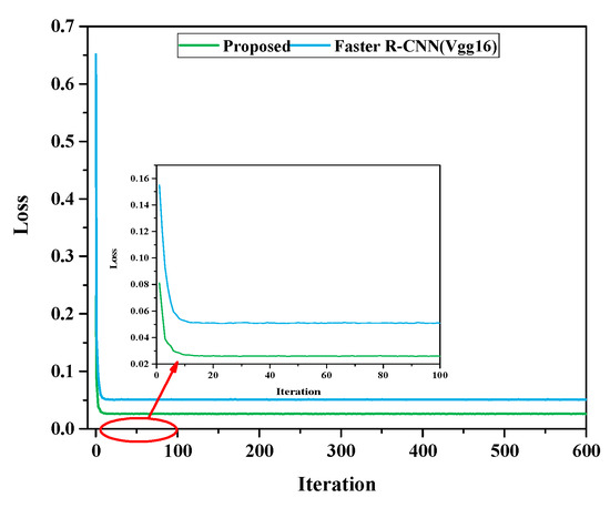 To evaluate the performance of the Gas R-CNN model, it was compared with the conventional Faster R-CNN model from different perspectives in this study. Figure 8 shows the loss curves of the two models after 600 iterations [40]. It can be seen that the Gas R-CNN model can be quickly reduced to 0.03 within the first 10 epochs, and the loss continues to decrease as the number of iterations increases, eventually stabilizing at 0.0262 ± 0.0001. While the conventional Faster R-CNN model drops to 0.0527 within the first 10 epochs, the value of its loss only stabilizes at approximately 0.0509 with an increasing number of iterations. The Gas R-CNN model exhibits better convergence and higher robustness.