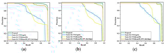 Precision–recall (PR) curves were used to assess the differences between the performances of the different models. IOU is the degree of overlap between the manually labeled true bounding box and the model-predicted bounding box. For a specified IOU, as shown in Equation (5), AP is the area under the PR curve, and mAP denotes the average AP value of the different categories in the test set.